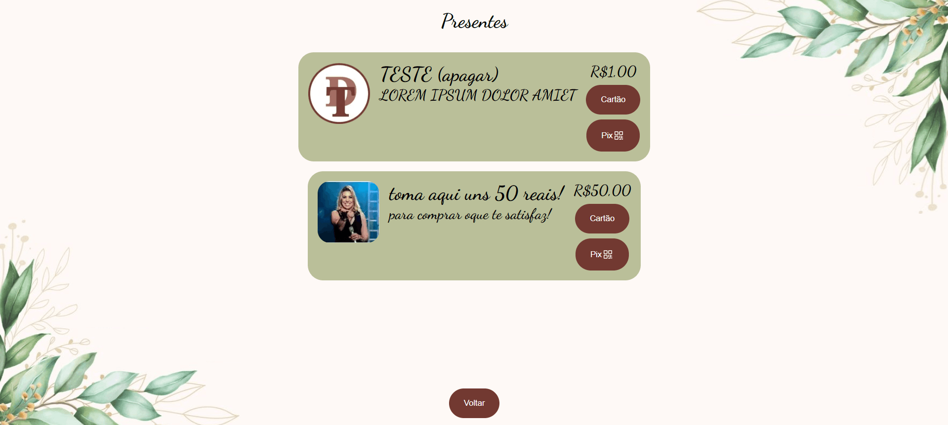 <li><strong>Presentes em Dinheiro:</strong> Opção para que os convidados enviem presentes em dinheiro via Pix e cartões de crédito e débito, proporcionando conveniência e flexibilidade.</li>